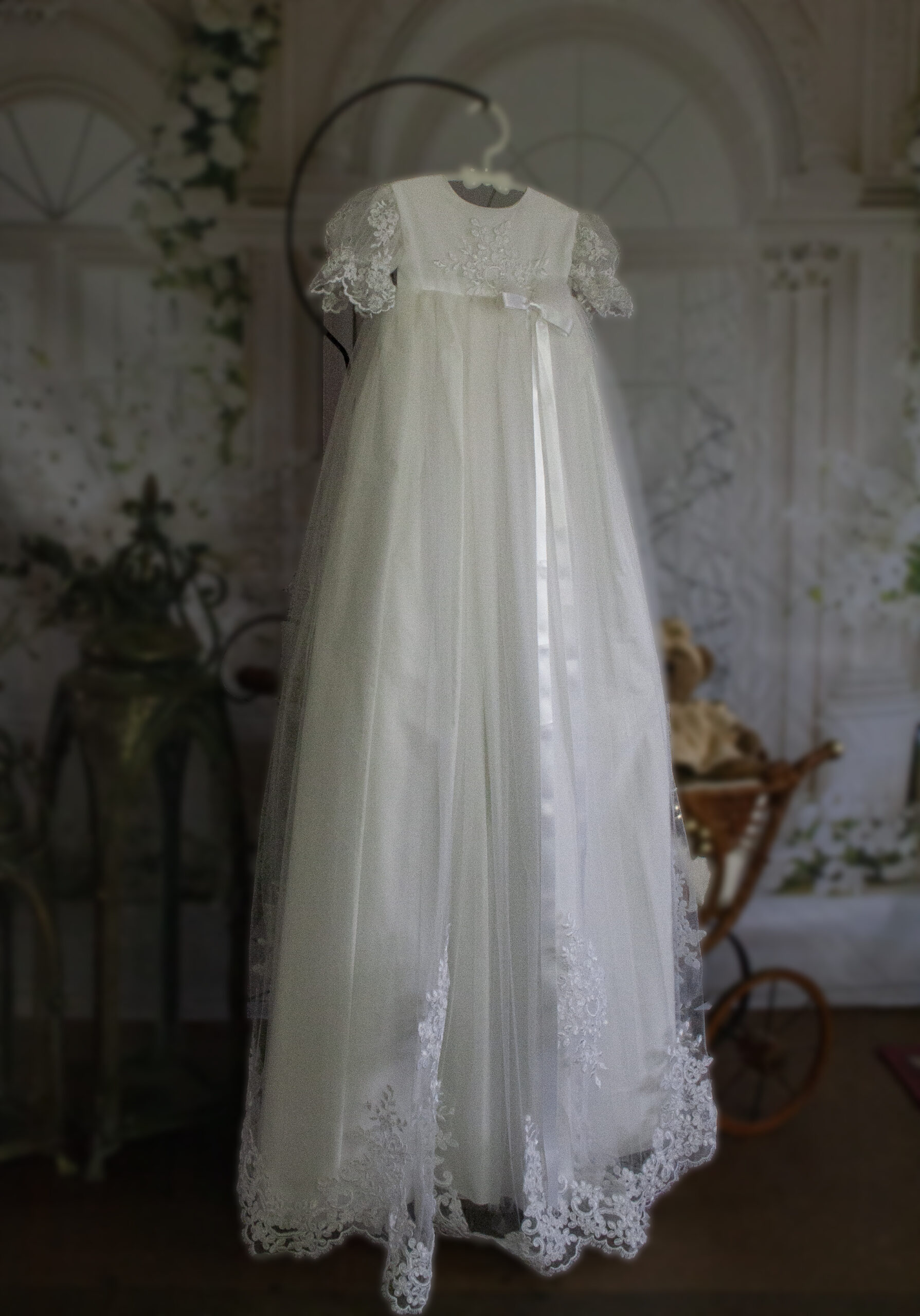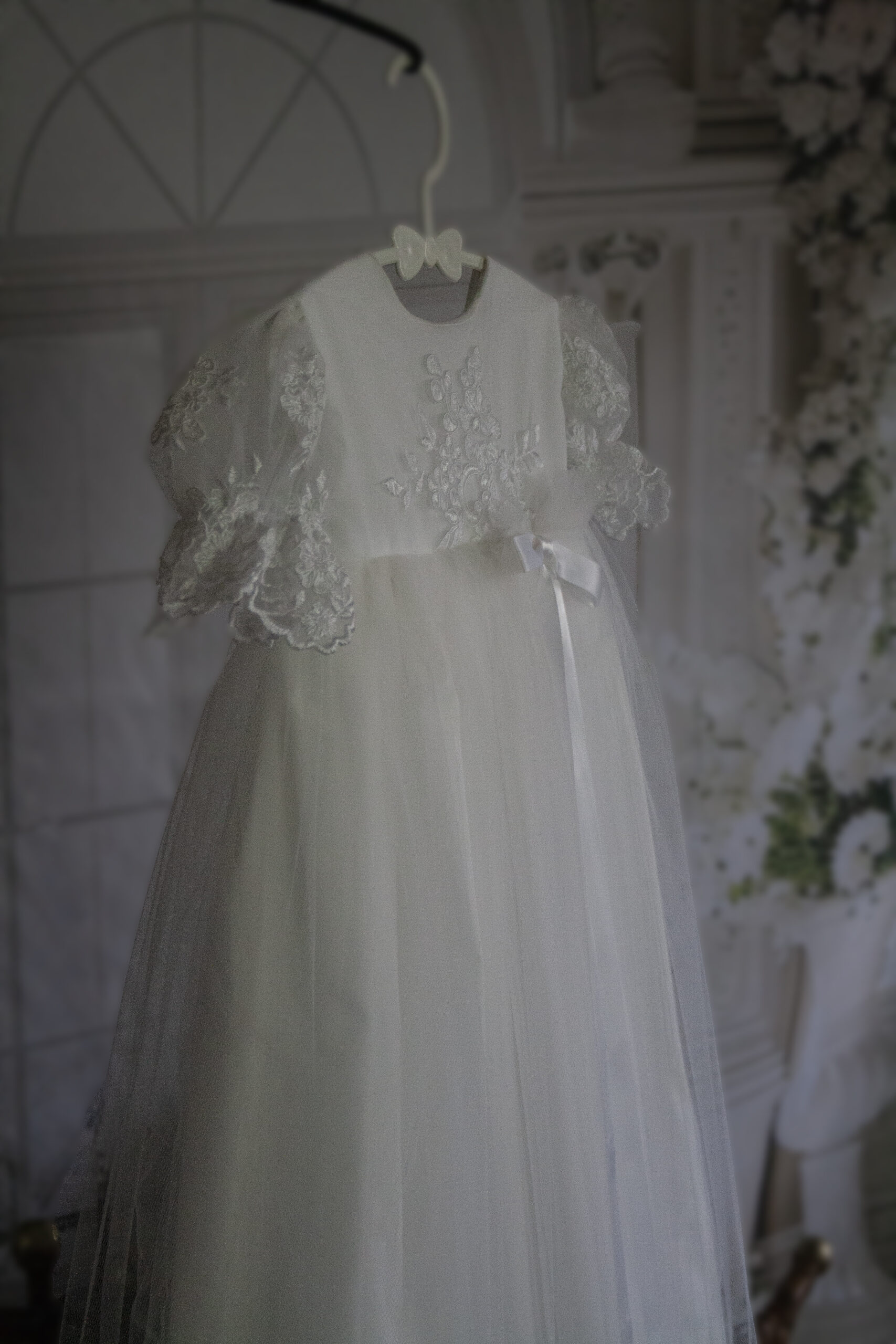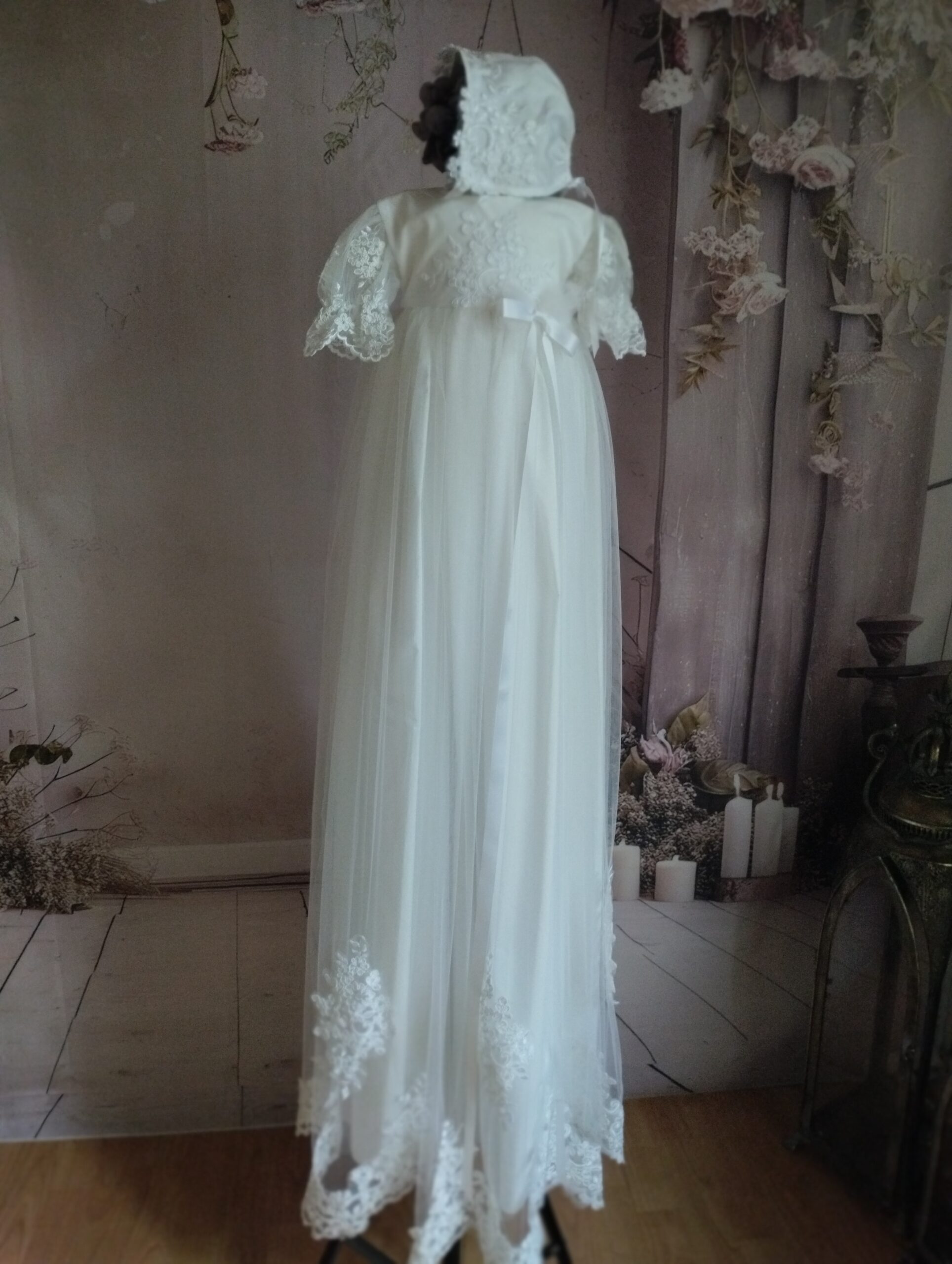 Gratis forsendelse i DKKridhvid dåbskjole til den helt nyfødte. En let og elegant dåbskjole i hvidt tyl med broderier. Smuk og tidløst design med et romantisk udtryk