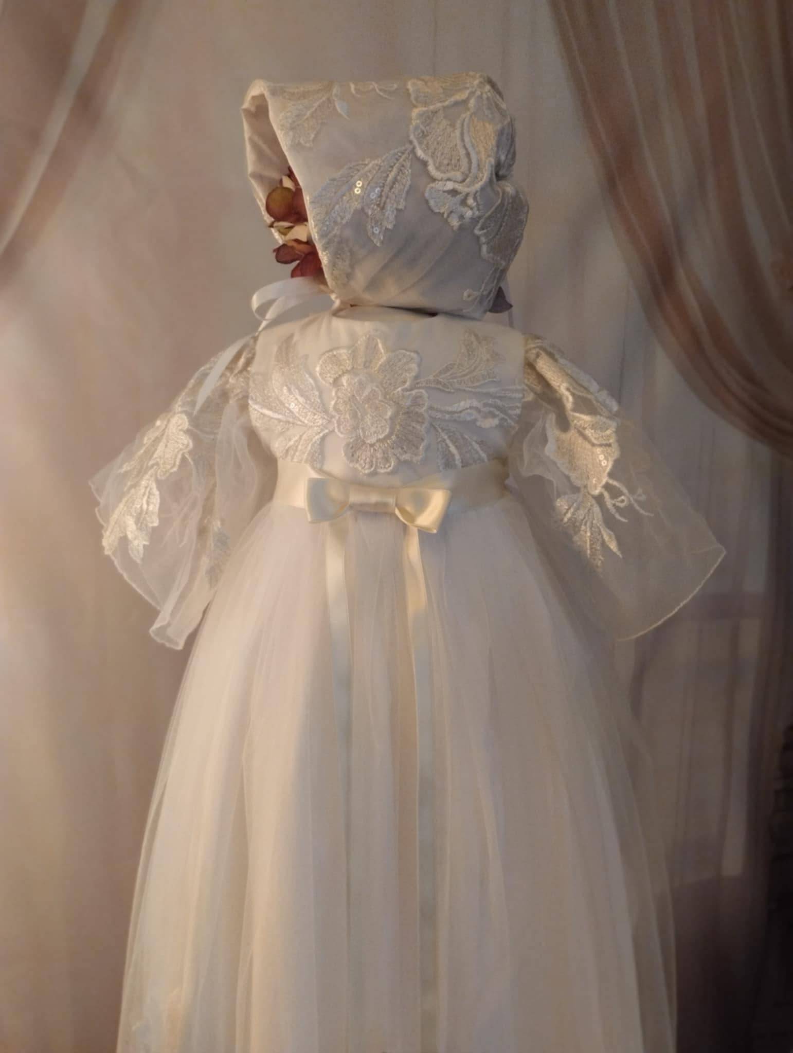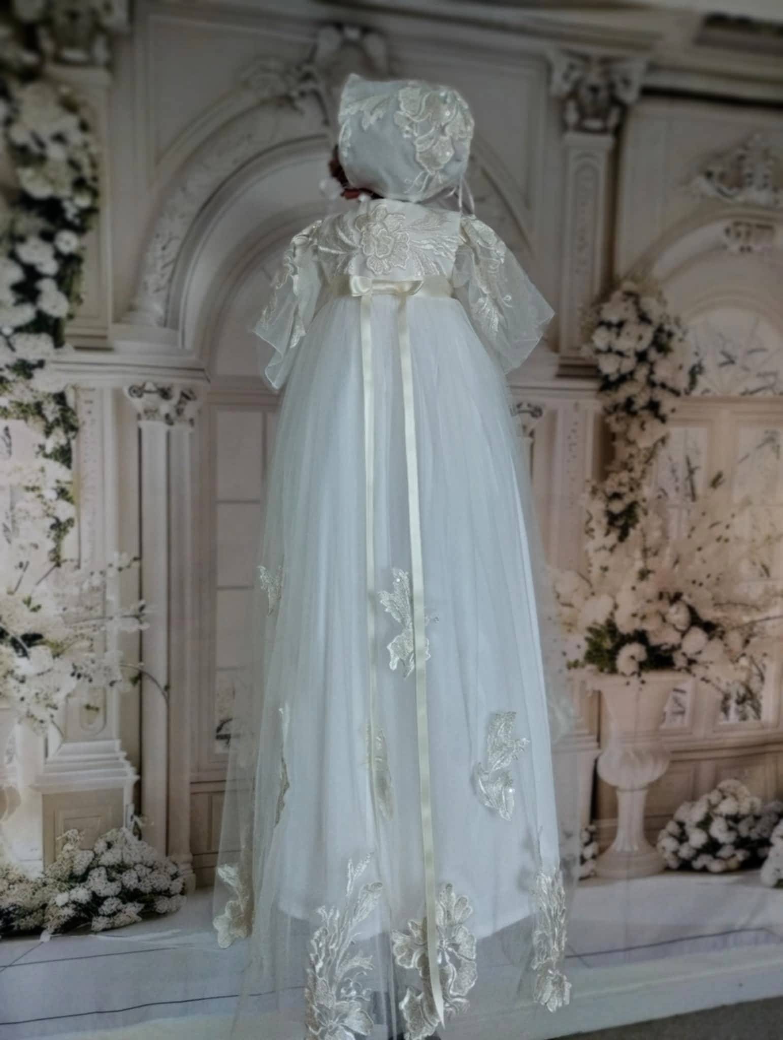 Gratis forsendelse i DKEn let og yndefuld dåbskjole i fine lag af tyl og broderier, der falder blødt og elegant. De sarte blomsterdetaljer og den matchende kyse giver kjolen et romantisk og tidløst udtryk, fyldt med ro, renhed og ynde.